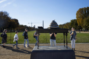 A bronze art installation depicting a ‘poop’ on former House Speaker Nancy Pelosi’s desk has been seen on October 31, 2024, on the National Mall Washington DC near the U.S. Capitol building.The Blossom Kite Festival in Washington, DC, on March 29, 2025.A person holds a sign with the text “Fuck Elon Musk” while protestors demonstrate at a ‘Hands Off’ protest against President Donald Trump and his advisor, Tesla CEO Elon Musk, on April 5, 2025, on the National Mall in Washington DC.